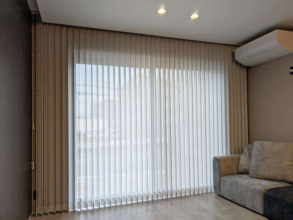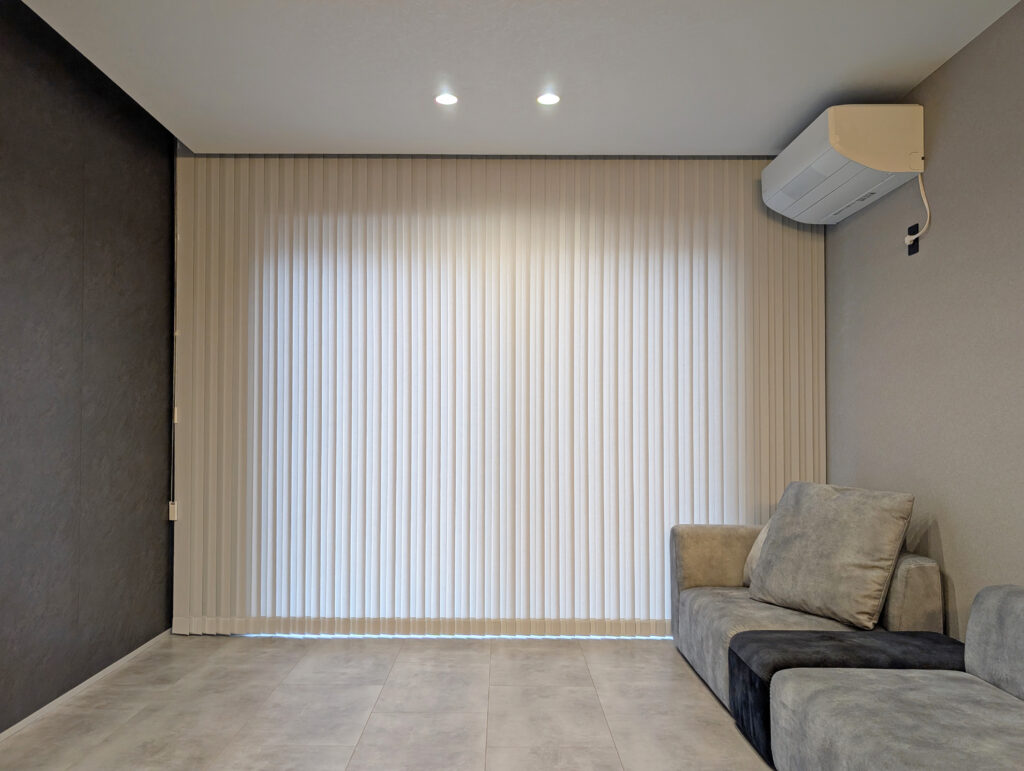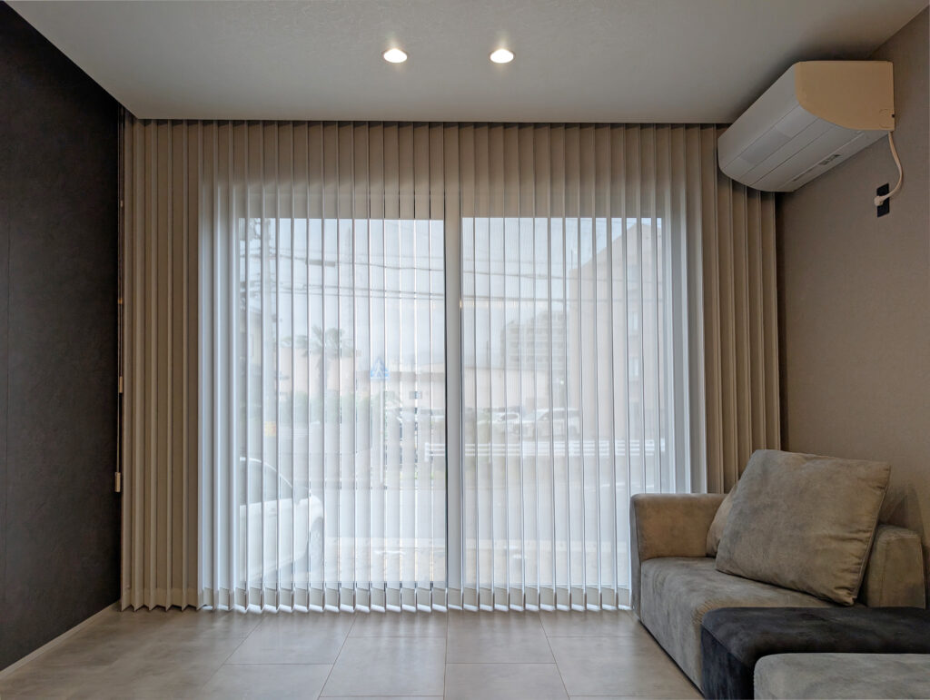 リビングの大きな窓にバーチカルブラインドを設置させていただきました。