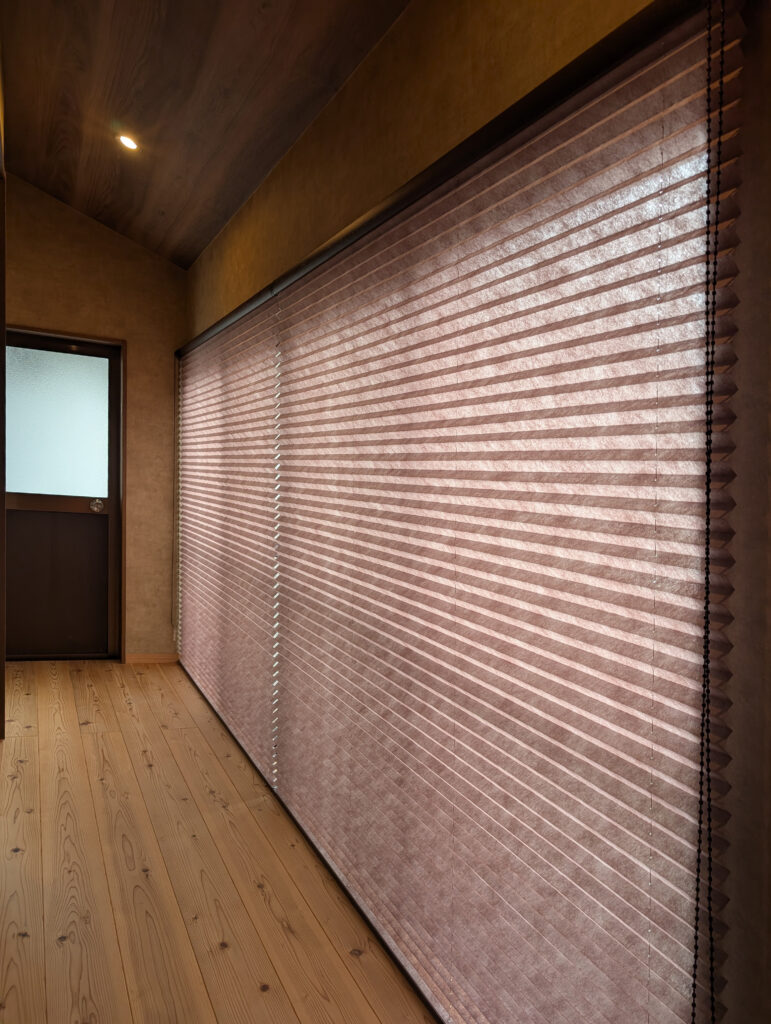 縁側に和風プリーツスクリーン(京都市伏見区) 2025 10/16 オーダーカーテン ブラインド・ロールスクリーン関係 プリーツスクリーン 和紙風プリーツスクリーン(ニチベイ) 和紙風で光の加減で濃淡が浮かび上がるプリーツスクリーンニチベイのもなみ(えにし)を設置させていただきました。 お部屋の雰囲気にもマッチしてとてもやさしい和の雰囲気に仕上がりました。 オーダーカーテン ブラインド・ロールスクリーン関係 プリーツスクリーン