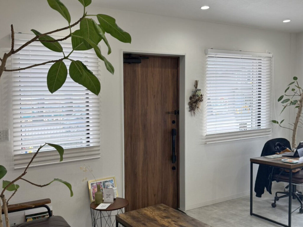 木製ブラインドは、光のコントロールがしやすく、プライバシーを確保しながら店内を明るく保てるため、