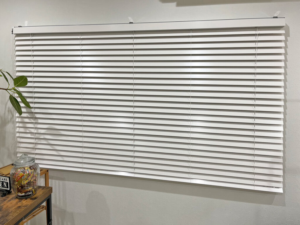 スラット幅50mmの木製ブラインドは、光の入り方が美しく、店内に落ち着きのある雰囲気を演出してくれます。