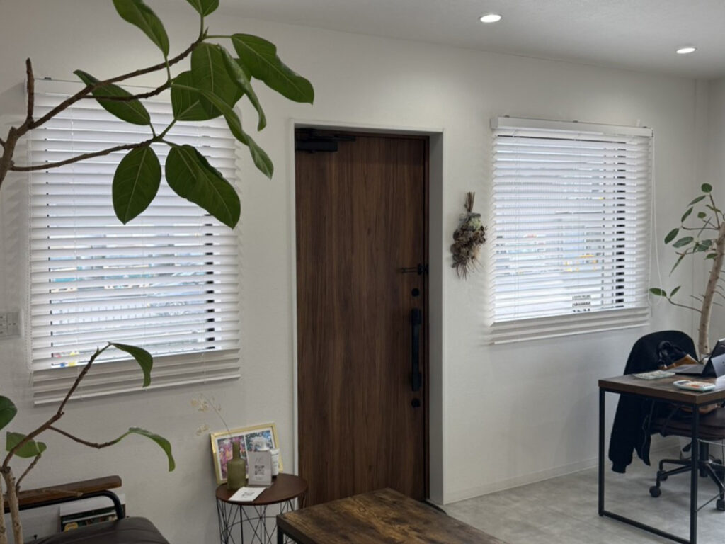 プレハブ小屋の間仕切りにタチカワブラインドのアコーディオンを設置させていただきました。